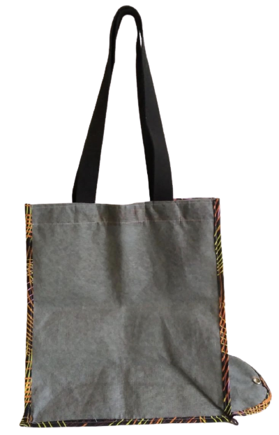 Saco para compras. Este é feito de tecido PET e capulana, é facilmente transportável e tem as seguintes dimensões: 42cm x 36cm (vertical).